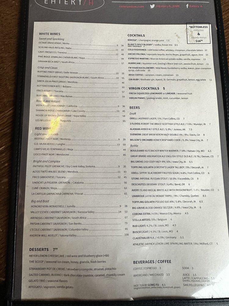 Located in Des Moines, Eatery A offers a trendy Mediterranean and Pizza dining experience. This restaurant not only takes reservations but also offers delivery and takeout options. With a variety of vegan and vegetarian dishes, it caters to different dietary preferences. The menu includes a range of beverages from still and sparkling water to juices and milk. Additionally, their wine selection features options from Portugal, Germany, South Africa, and more.